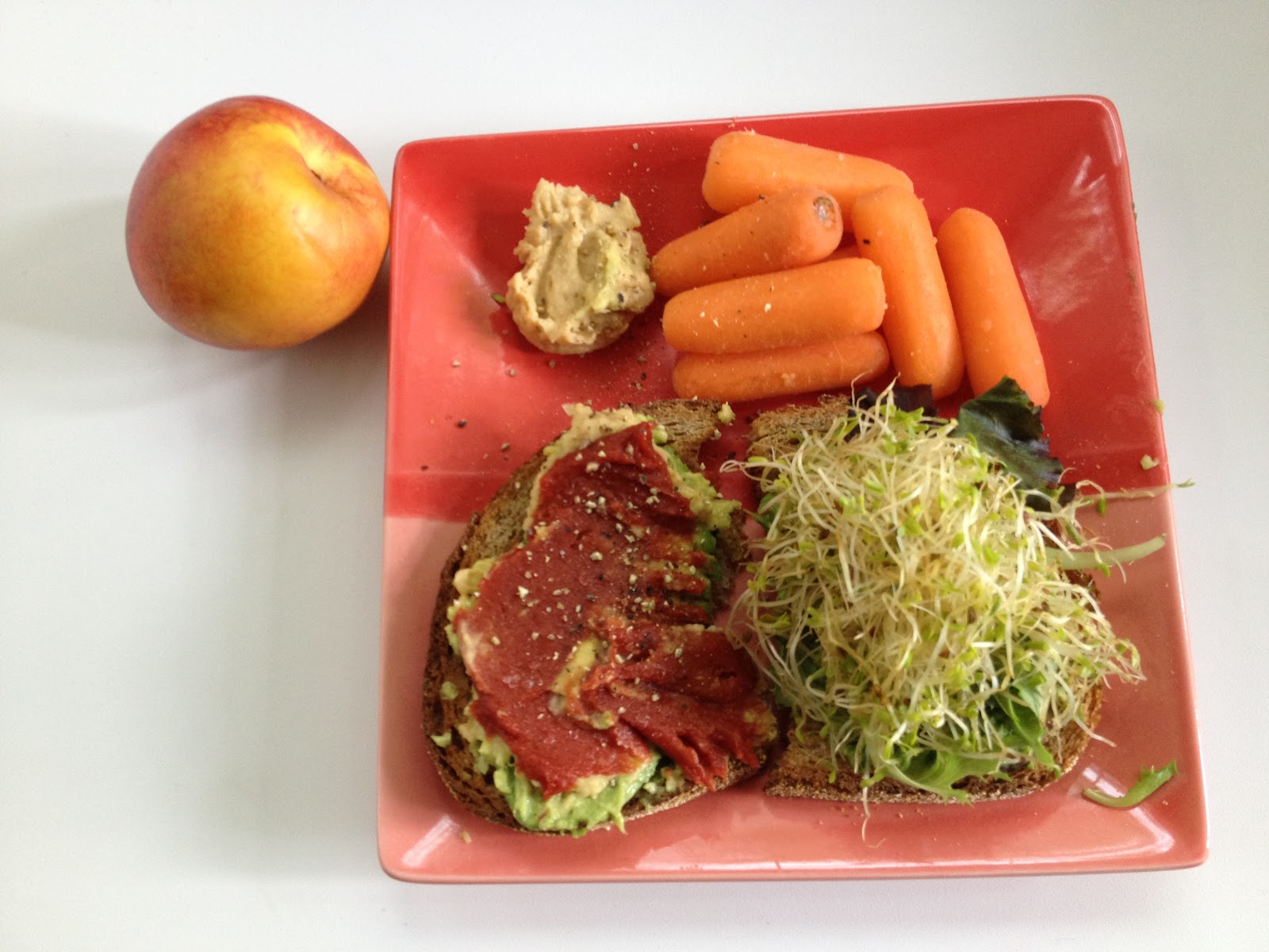 - Sandwich of avocado, tomatoes, smart balance, and salt + pepper on Ezekiel Bread
